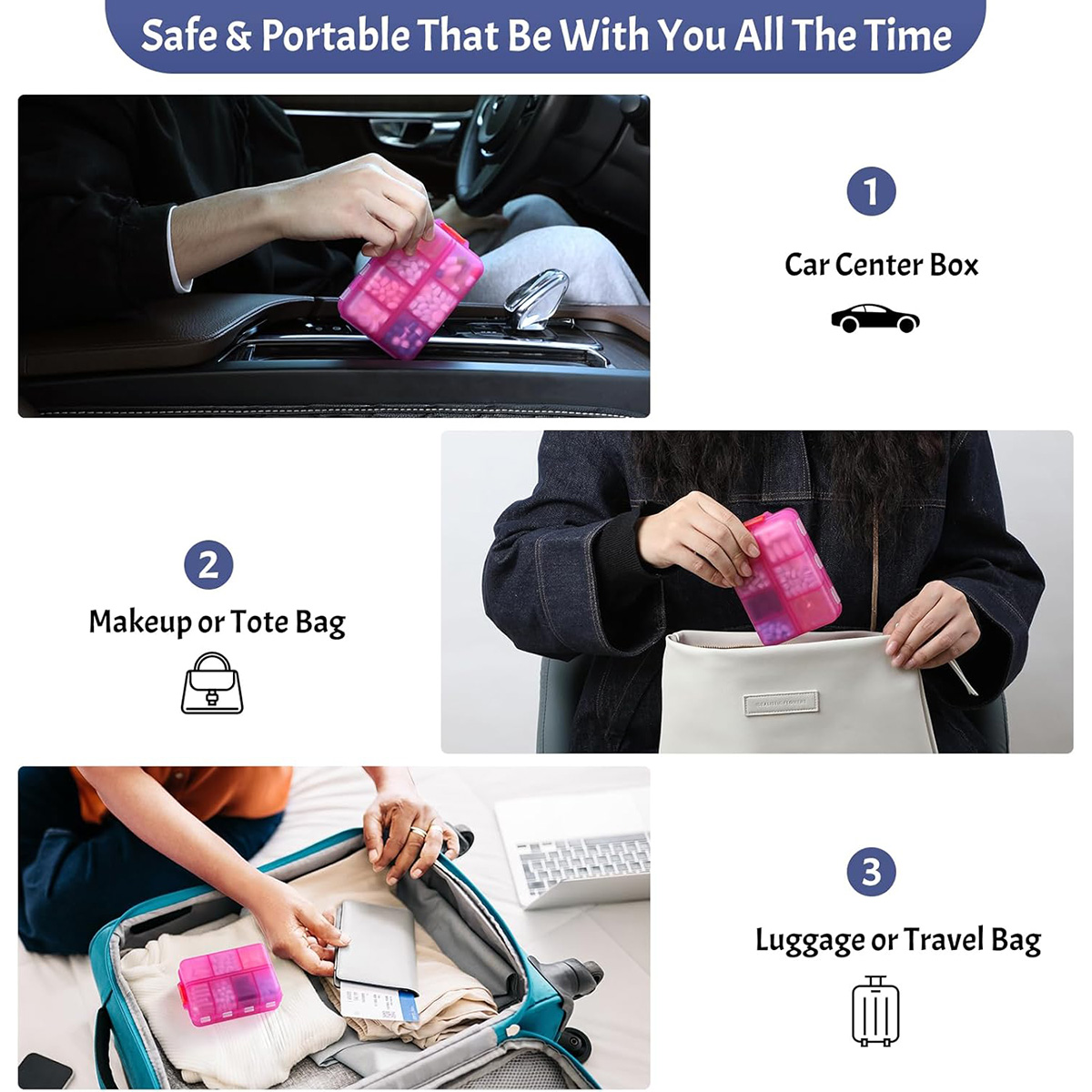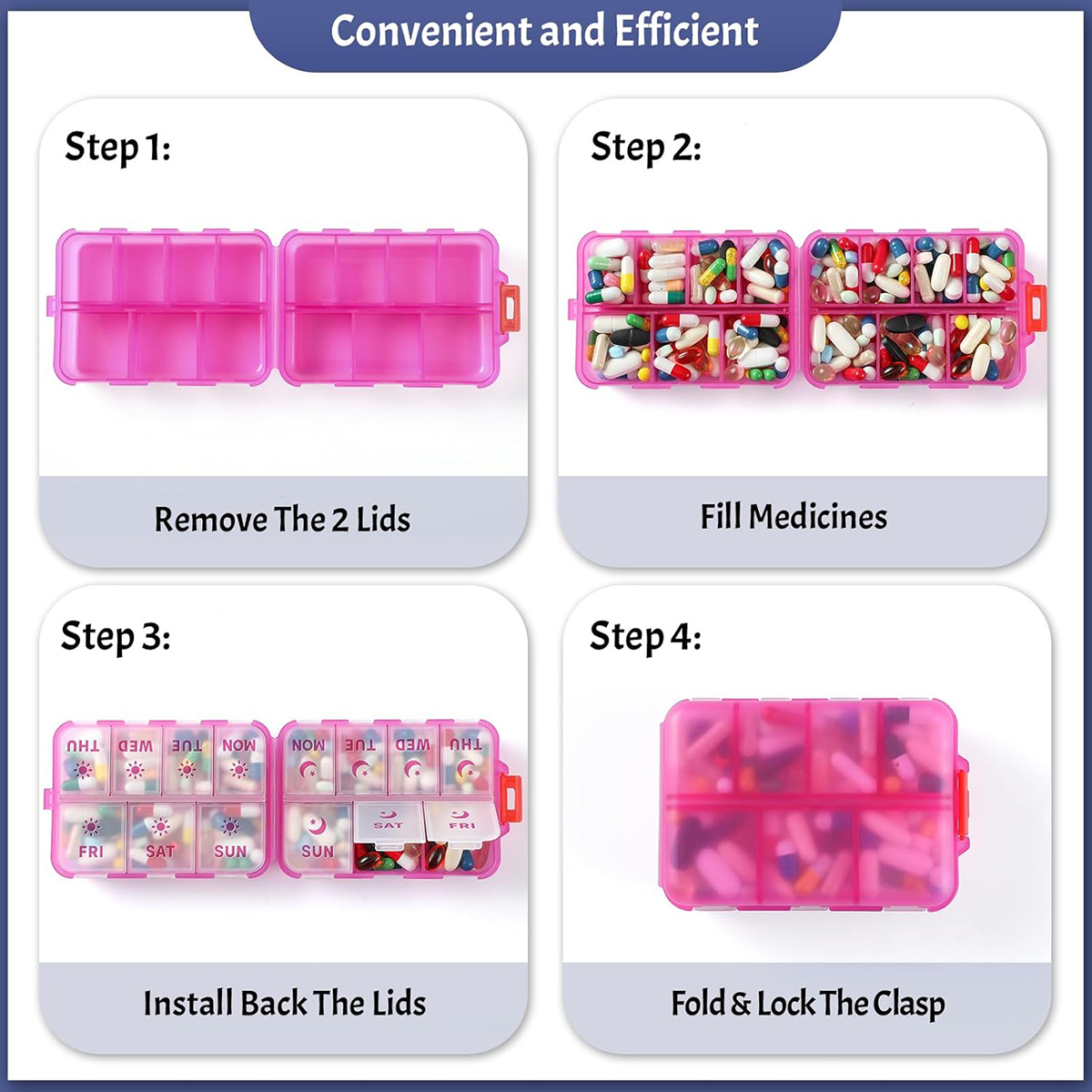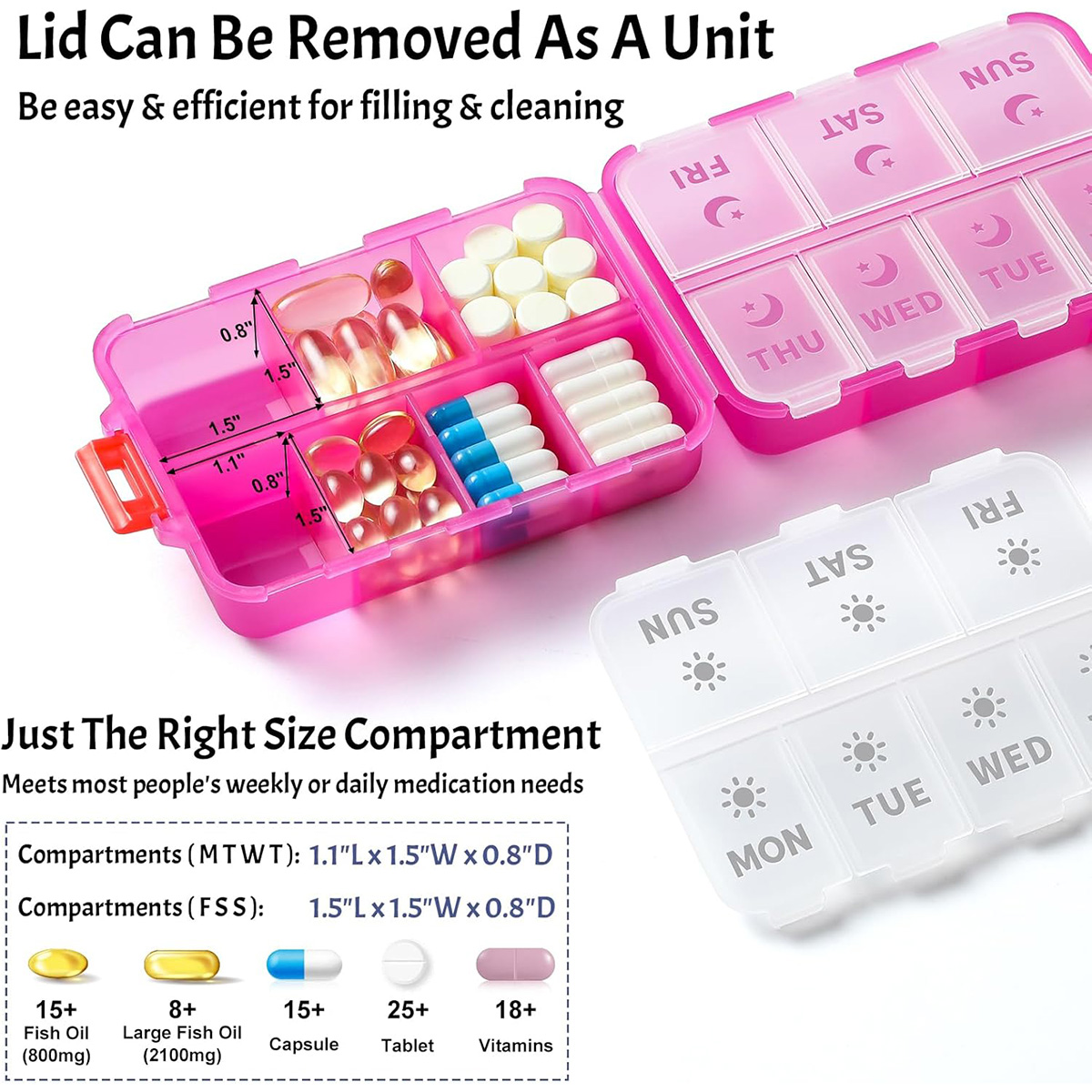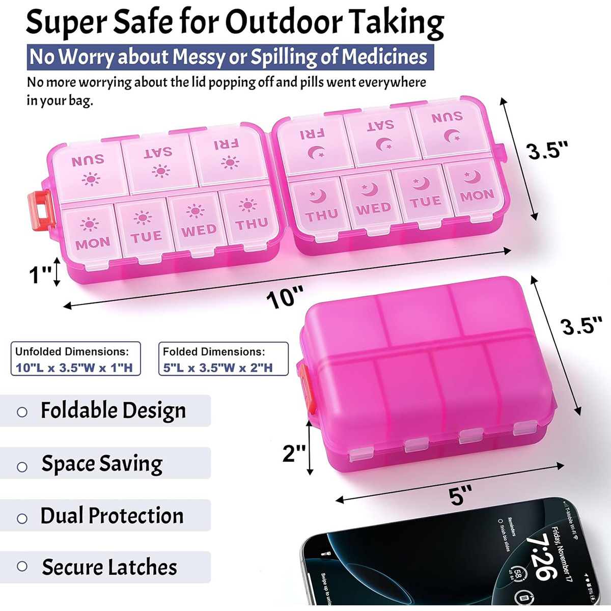 New Foldable & Double Protection Portable Weekly Pill Organizer 2 Times A Day with Etched Labels Daily Travel Pill Case Dispenser – Clear Pink