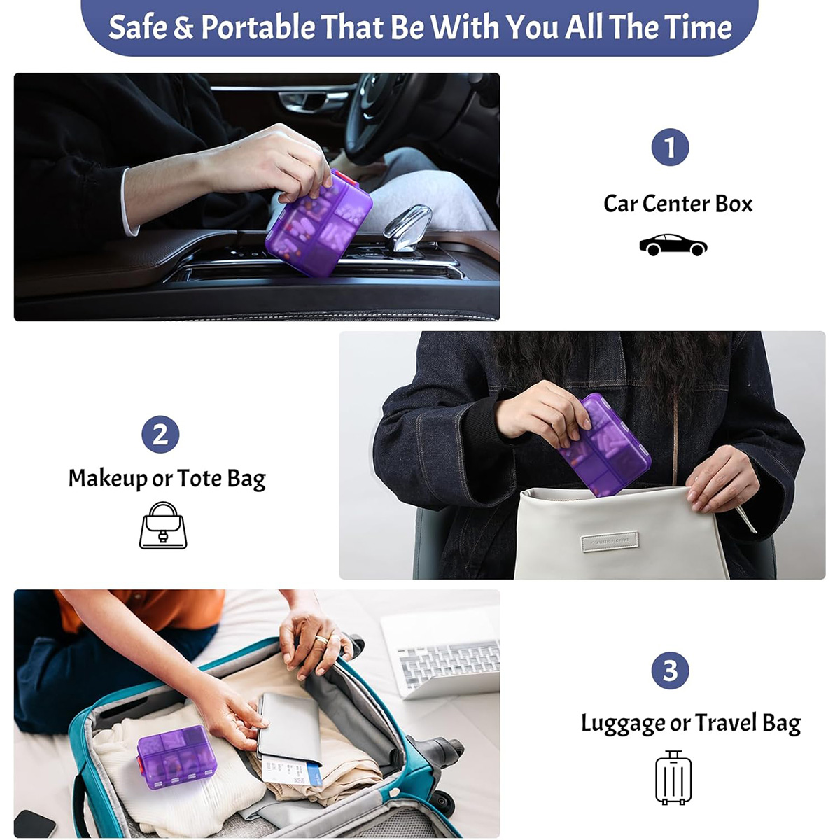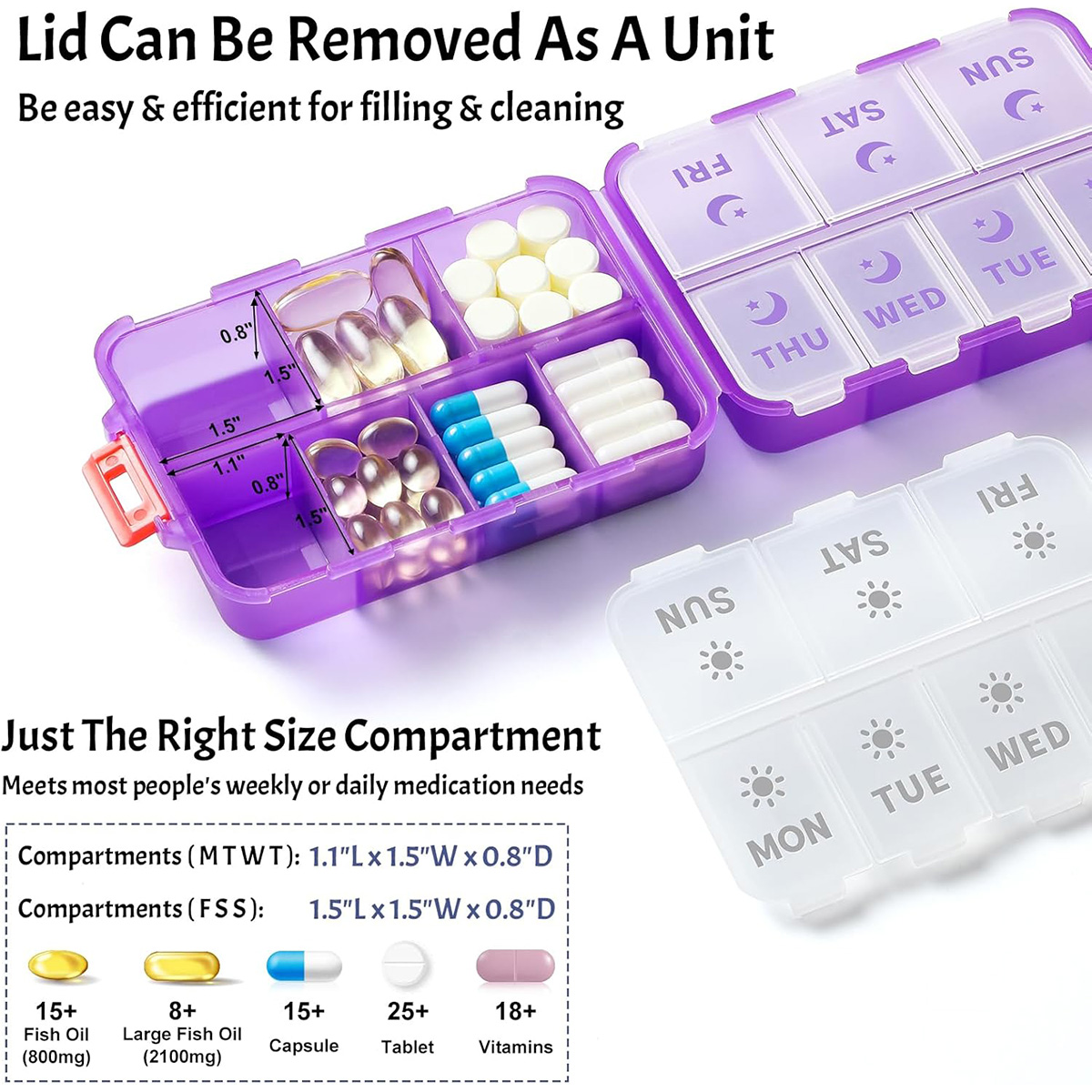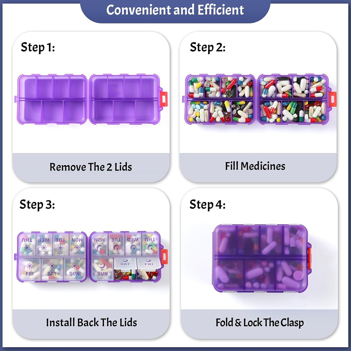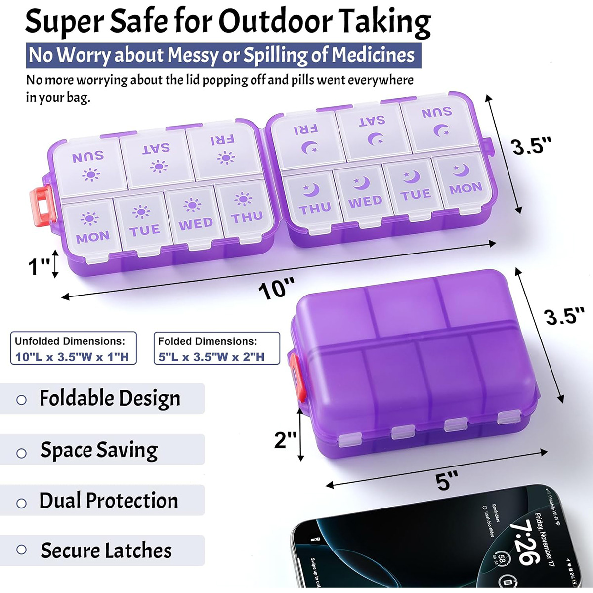NEW Foldable & Double Protection Portable Weekly Pill Organizer 2 Times A Day with Etched Labels Daily Travel Pill Case Dispenser – Clear Purple