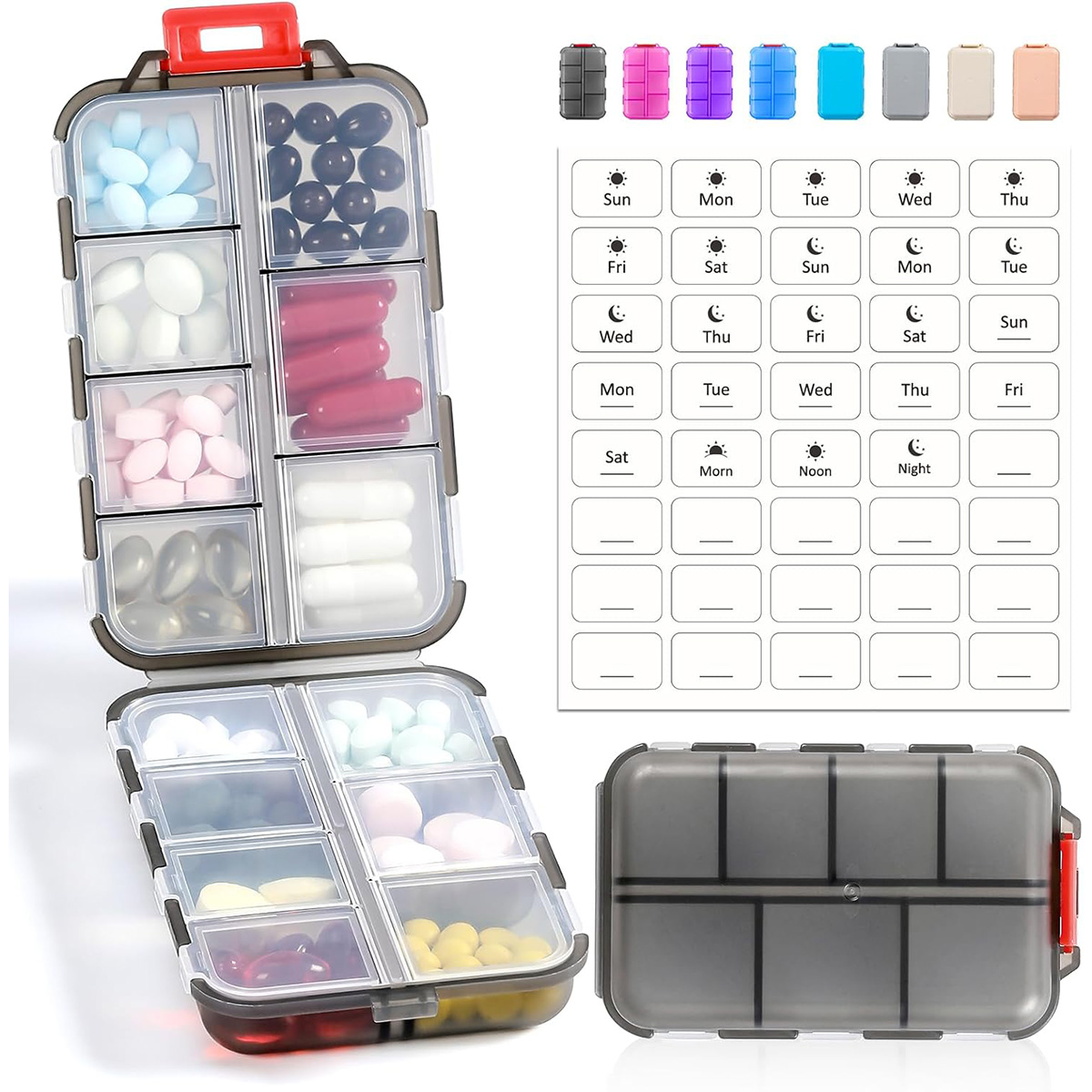 14 GRIDS Travel Pill Organizer Box with Labels – Travel Medicine Case Kit – Pocket Daily Pharmacy Container – Clear Gray