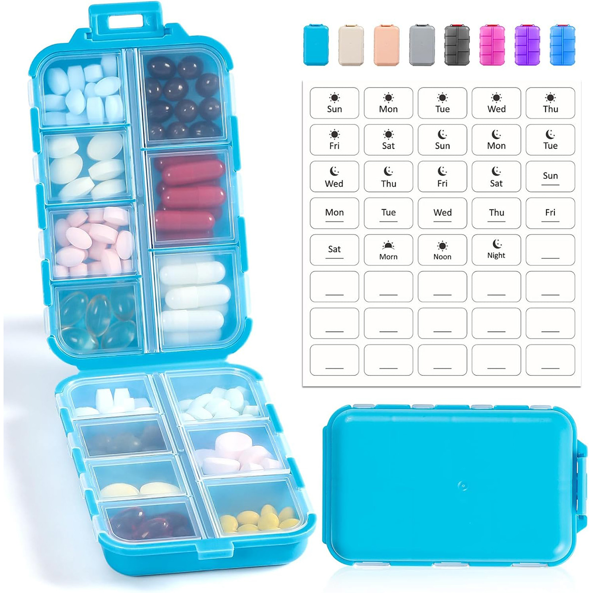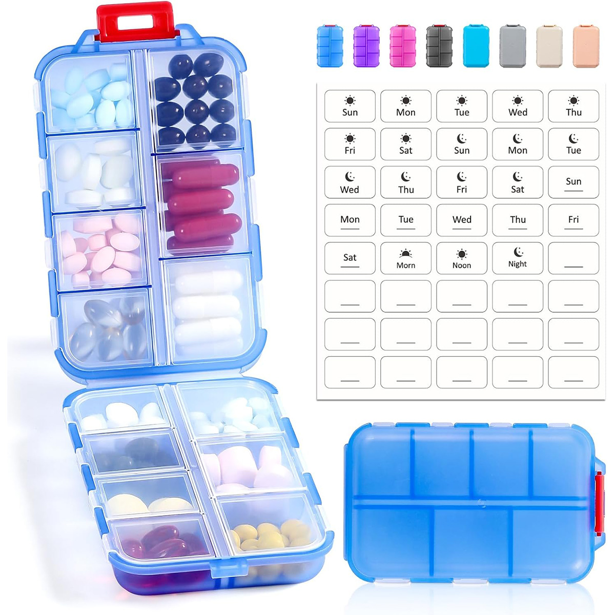 14 GRIDS Travel Pill Organizer Box with Labels – Travel Medicine Case Kit – Pocket Daily Pharmacy Container – Blue