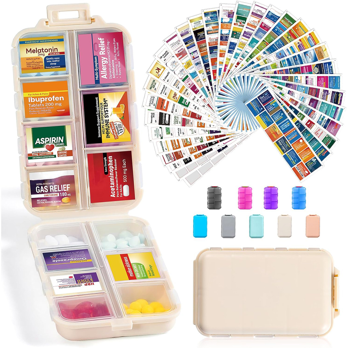 14 Grids Travel Pill Organizer Box with 415-Pcs Medicine Name Labels – Pocket Daily Pharmacy Case Container Kit – Khaki