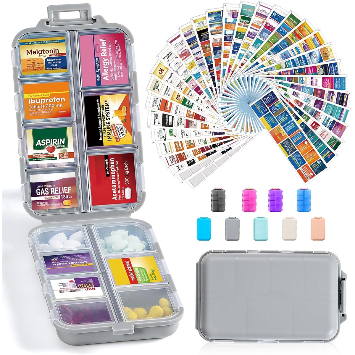 14 Grids Travel Pill Organizer Box with 415-Pcs Medicine Name Labels – Pocket Daily Pharmacy Case Container – Grey