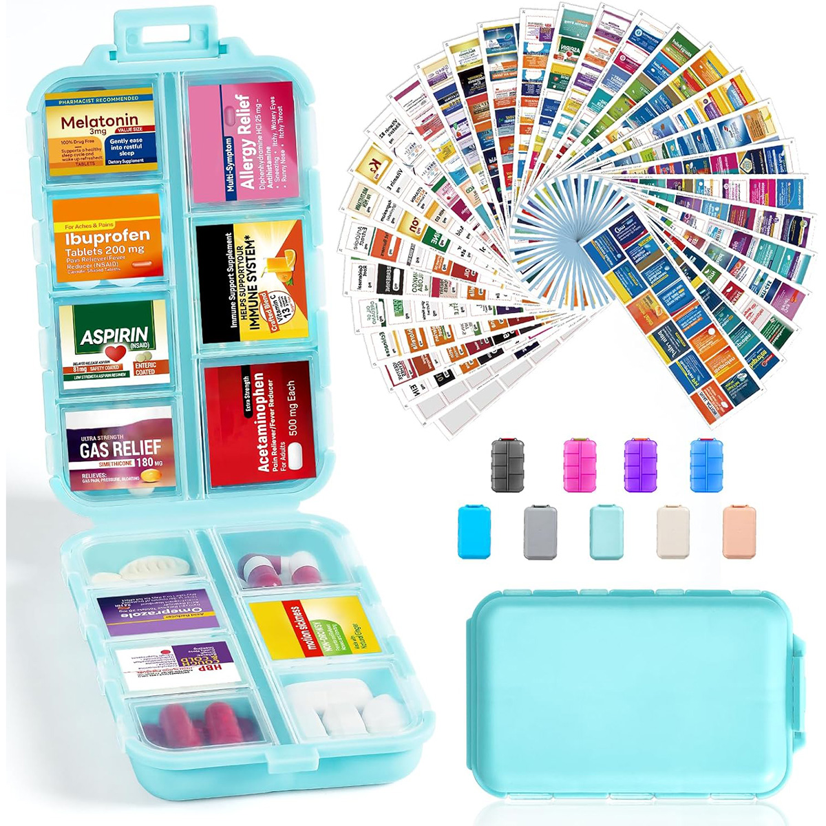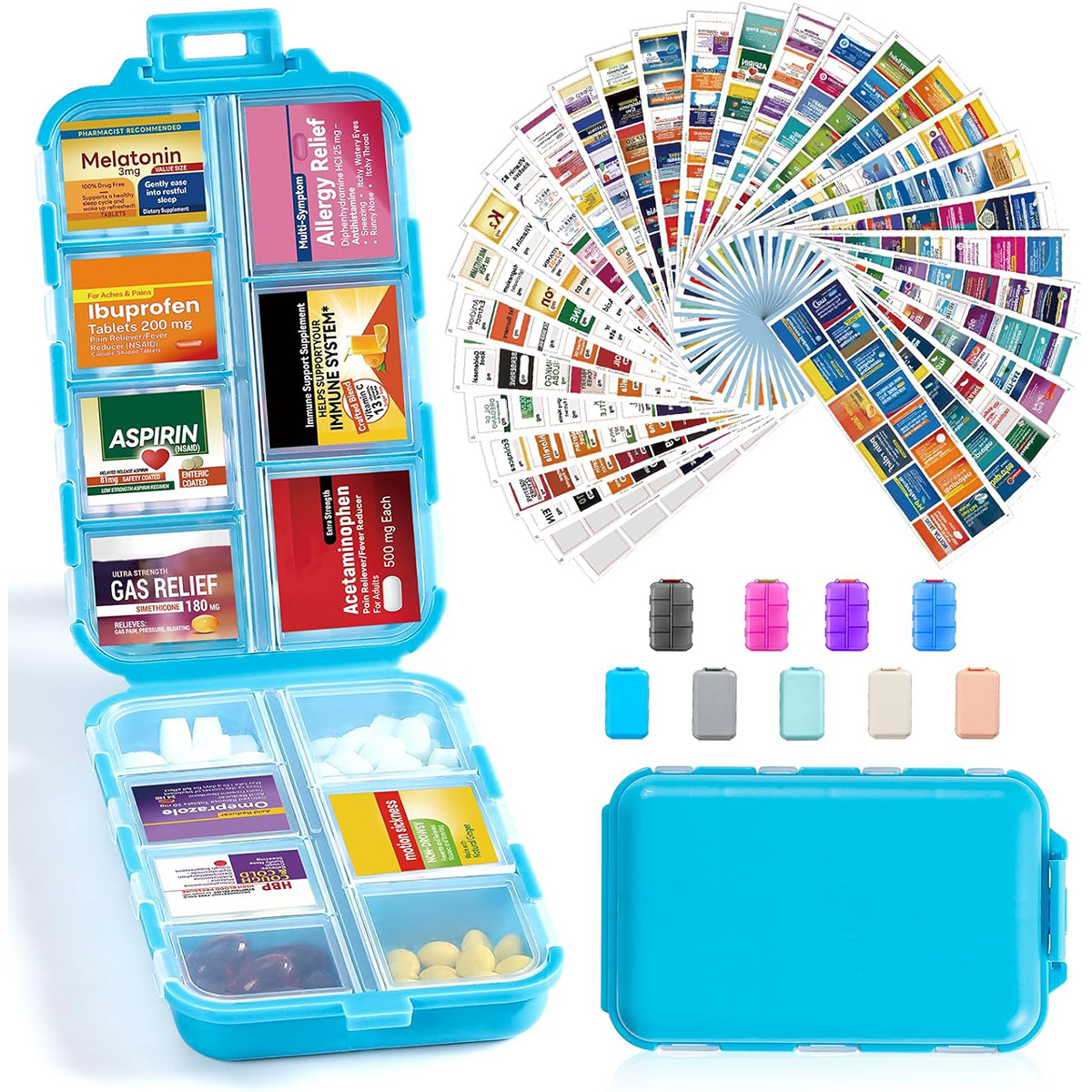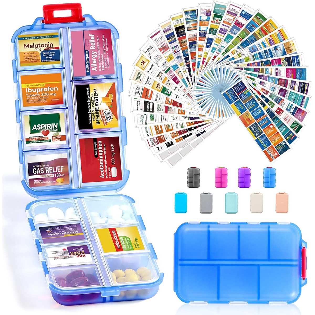 14 Grids Travel Pill Organizer Box with 415-Pcs Medicine Name Labels – Pocket Daily Pharmacy Case Container Kit -Clear Blue