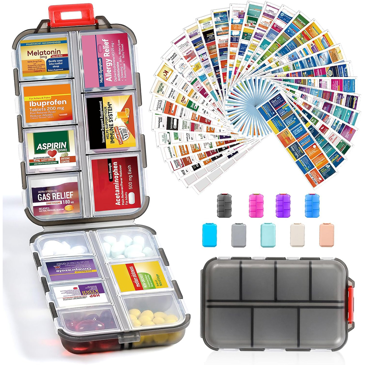 14 Grids Travel Pill Organizer Box with 415-Pcs Medicine Name Labels – Pocket Daily Pharmacy Case Container Kit -Clear Grey