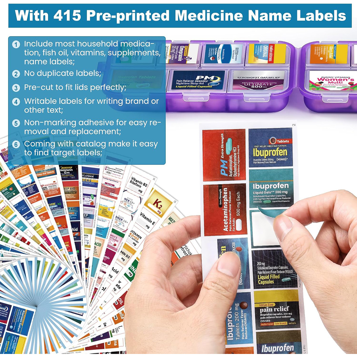 14 Grids Travel Pill Organizer Box with 415-Pcs Medicine Name Labels – Pocket Daily Pharmacy Case Container – Clear Purple