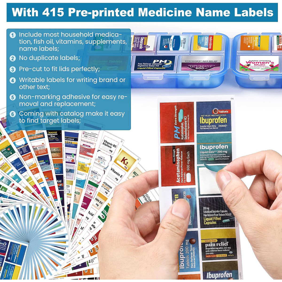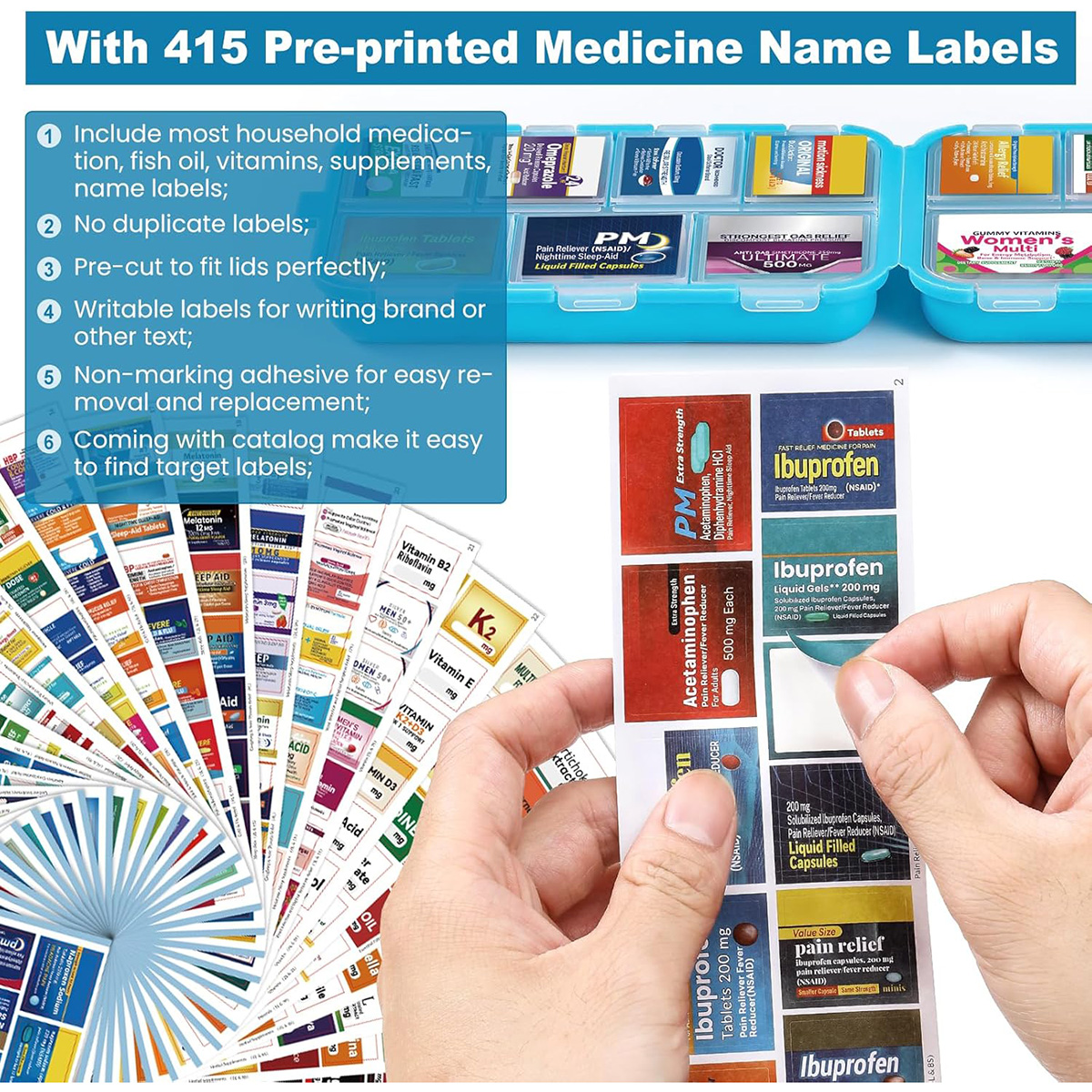 14 Grids Travel Pill Organizer Box with 415-Pcs Medicine Name Labels – Pocket Daily Pharmacy Case Container Kit -Clear Blue