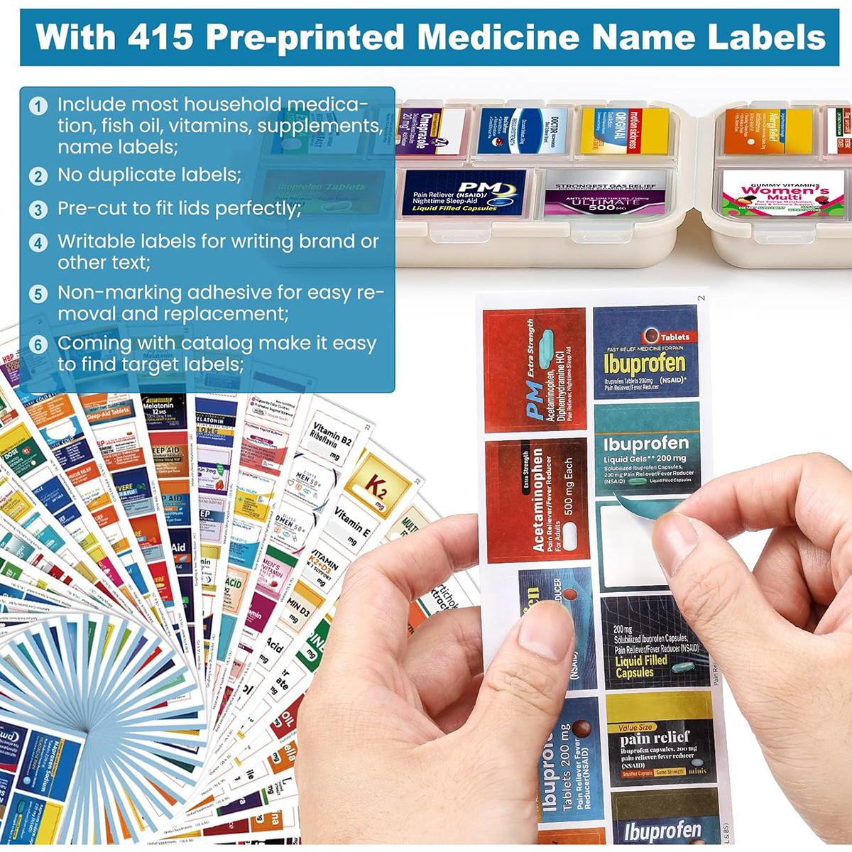 14 Grids Travel Pill Organizer Box with 415-Pcs Medicine Name Labels – Pocket Daily Pharmacy Case Container Kit – Khaki