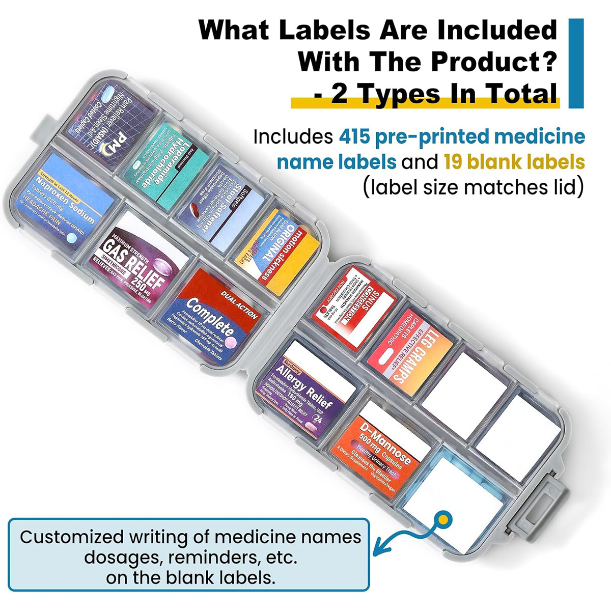 14 Grids Travel Pill Organizer Box with 415-Pcs Medicine Name Labels – Pocket Daily Pharmacy Case Container – Grey
