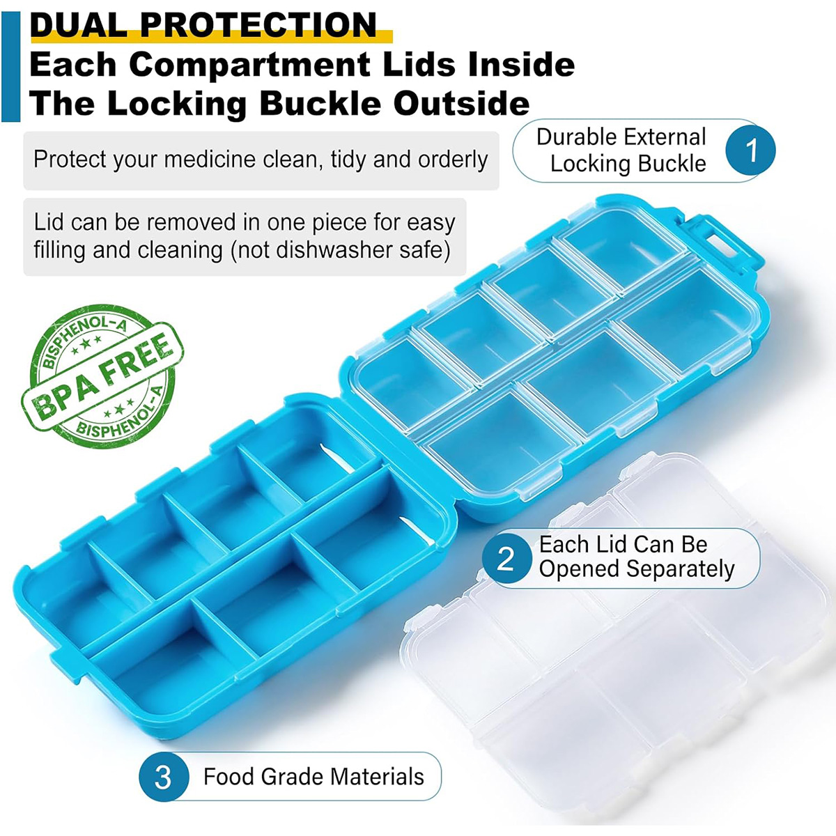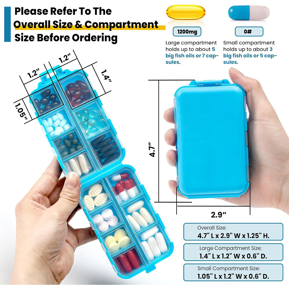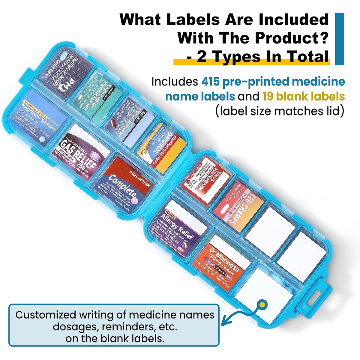 14 Grids Travel Pill Organizer Box with 415-Pcs Medicine Name Labels – Pocket Daily Pharmacy Case Container Kit – Blue