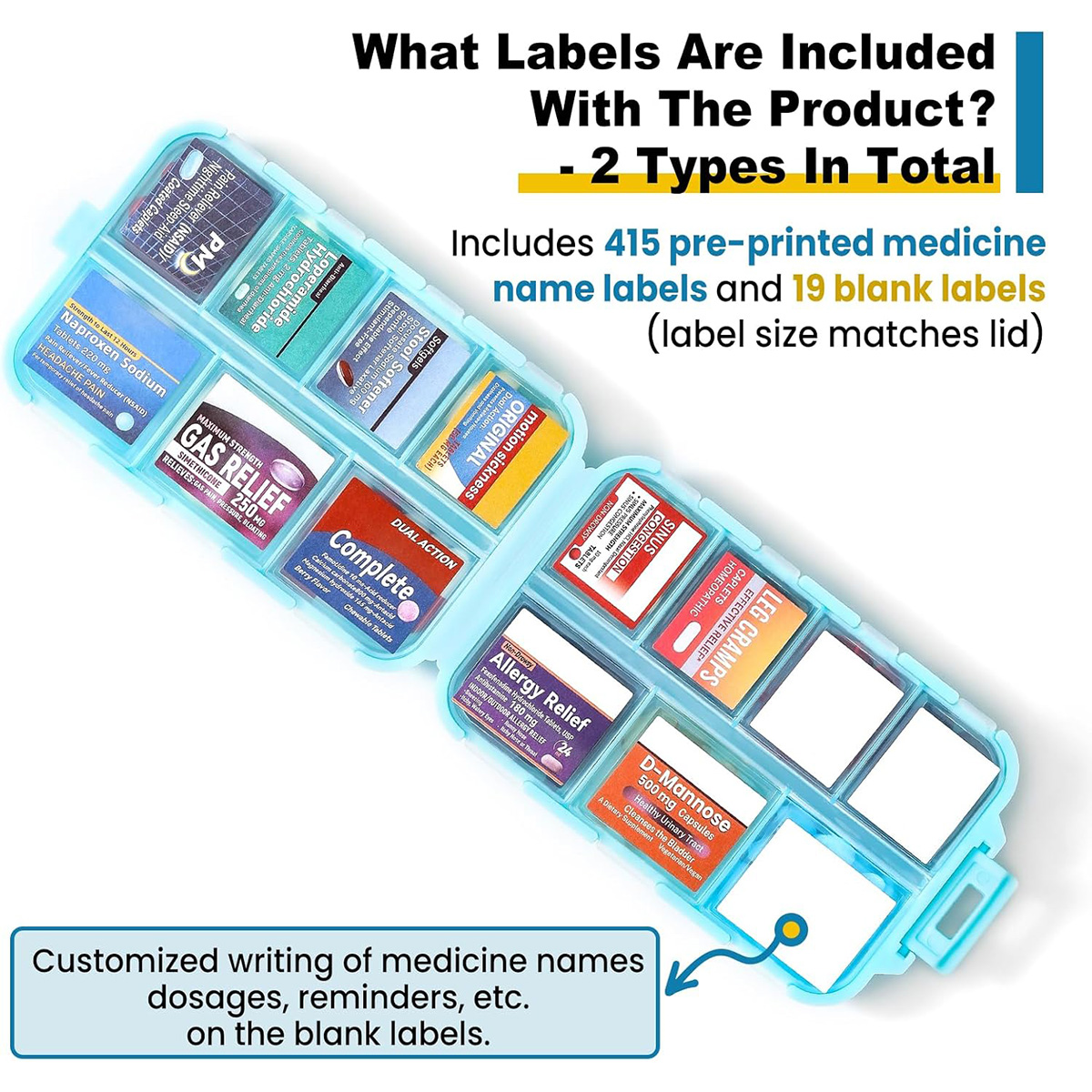 14 Grids Travel Pill Organizer Box with 415-Pcs Medicine Name Labels – Pocket Daily Pharmacy Case Container Kit – Sky Blue