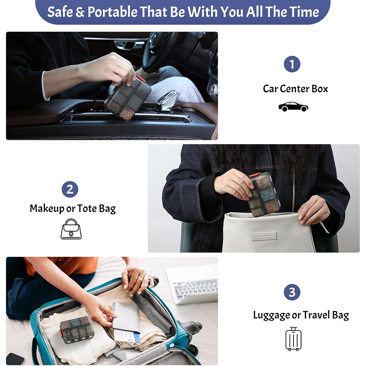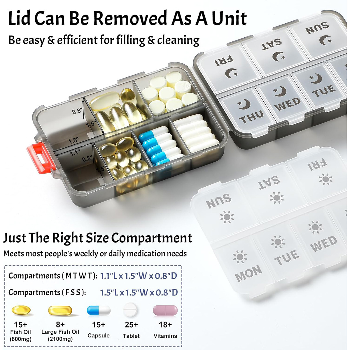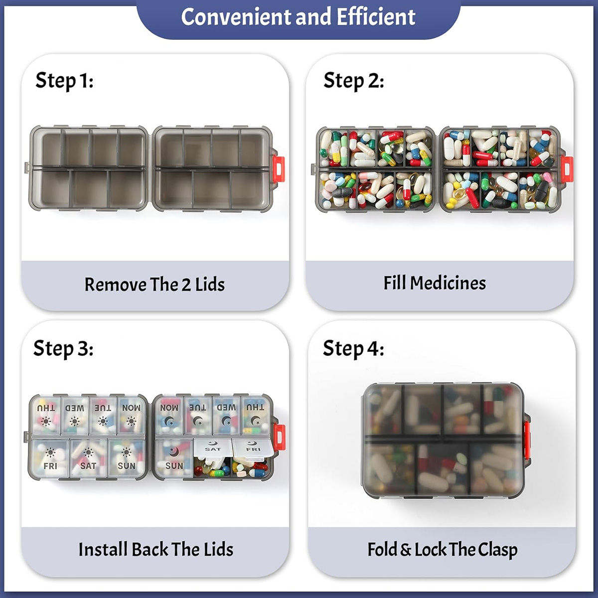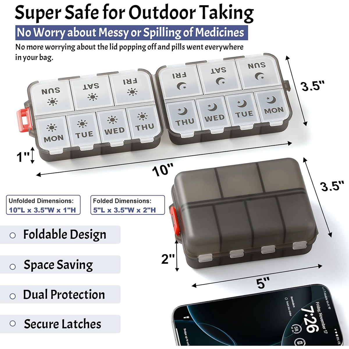 New Foldable & Double Protection Portable Weekly Pill Organizer 2 Times A Day with Etched Labels Daily Travel Pill Case Dispenser – Clear Black
