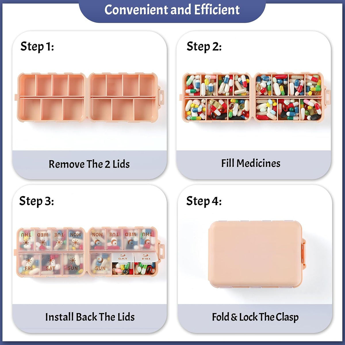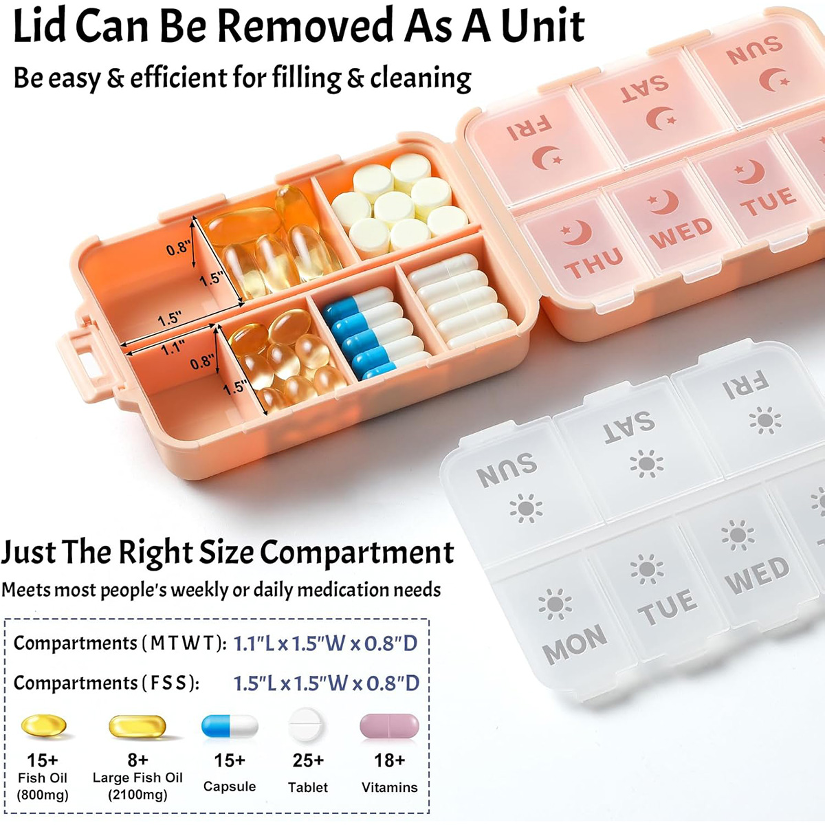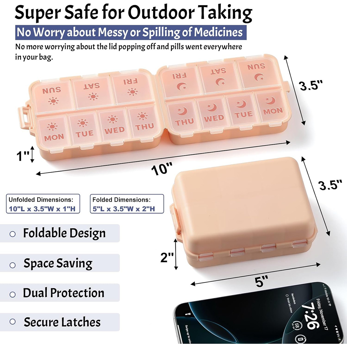 New Foldable & Double Protection Portable Weekly Pill Organizer 2 Times A Day with Etched Labels Daily Travel Pill Case Holder Dispenser – Pink
